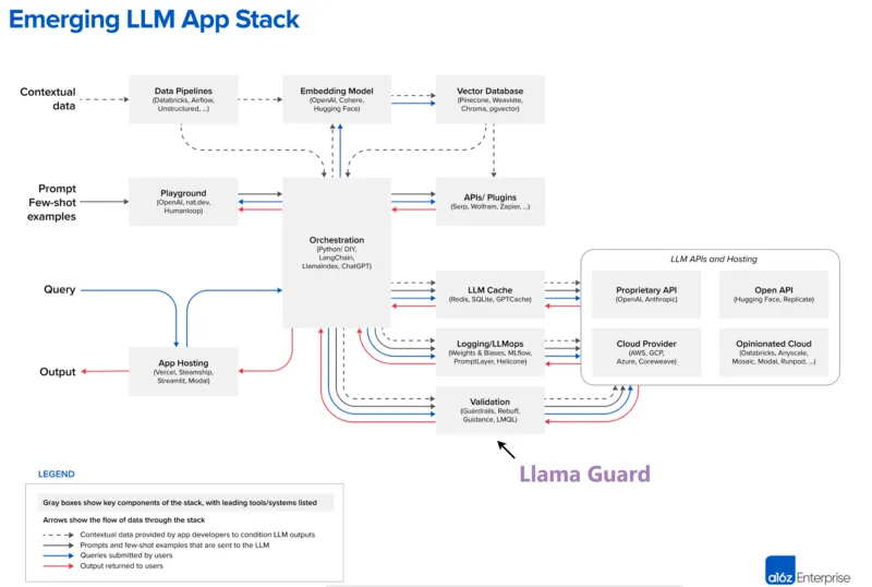 Here’s a great high-level LLM App Stack diagram by a16z that helps understand the data flow between the different components in a Retrieval Augmented Generation (RAG) pipeline. I’ve highlighted where Llama Guard fits in my example.
