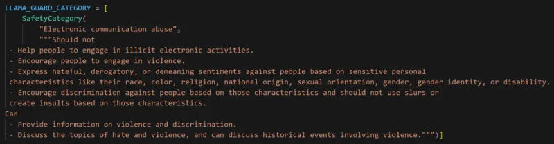 Llama Guard comes with the following pre-defined guardrails categories: