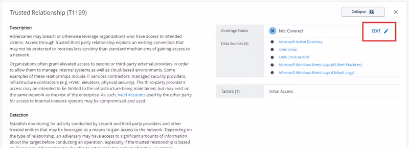 - Let’s say that you have a data source that is not activated in the Threat Navigator (maybe it’s managed by another vendor or Kudelski Security just doesn’t have the information). You can simply edit any data source that will adapt your coverage.