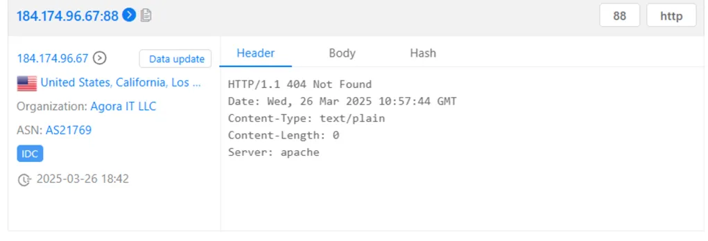 The IP was clearly hosting a Cobalt Strike server, as evidenced by its HTTP status code 404 and the “Content-Length: 0”
