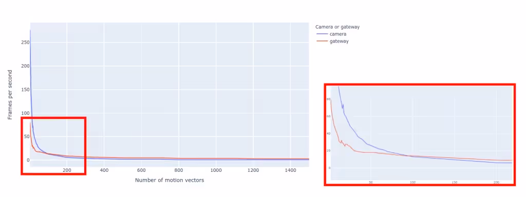 We can see that the camera outputs more frames per second for smaller numbers of motion vectors (up to 95). Then, the gateway and the camera appear to be able to output similar FPS rates, for larger numbers of motion vectors.