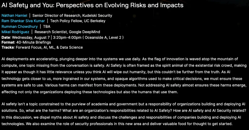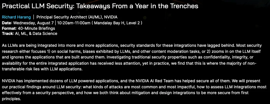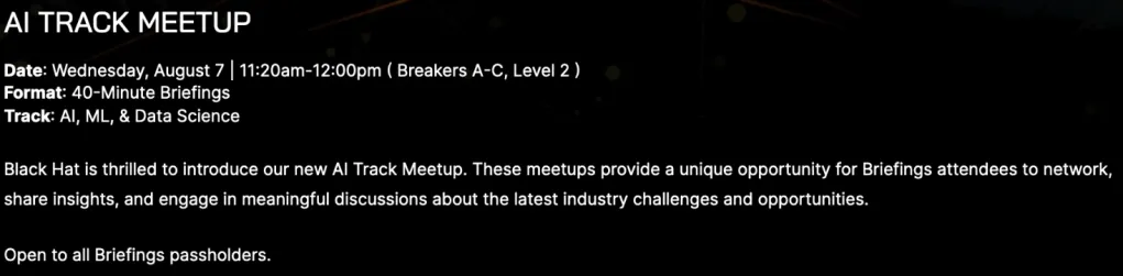This year, I’ll be hosting the new AI Track Meetup. Black Hat is setting aside space for networking on specific content areas. This is a zero-stress environment where you can discuss AI challenges and topics with fellow attendees and speakers. I’m also happy to discuss AI track specifics, content, as well as feedback on submitting to the track. Chatham House rule will be in effect, so feel comfortable sharing and don’t worry if there are things you don’t know about, we are all learning together.