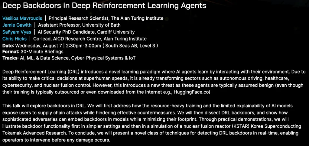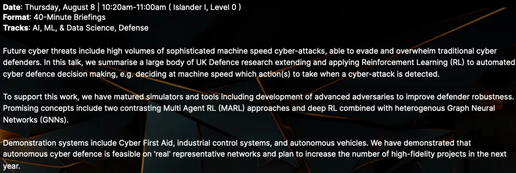 I’m a fan of reinforcement learning. Before everyone lost their minds over generative AI, reinforcement learning paved the way for solving difficult problems. This year, there are two very interesting reinforcement learning talks from different perspectives, one offensive and one defensive. These are cutting-edge approaches, and as such, it’s important to highlight the risks as well as the applications of the technology.