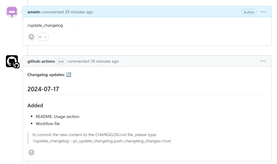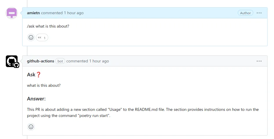 In both of the above cases, PR-Agent will read the comment, determine if there’s a known command to execute, and if so, generate a response and post it as another comment on that pull request.