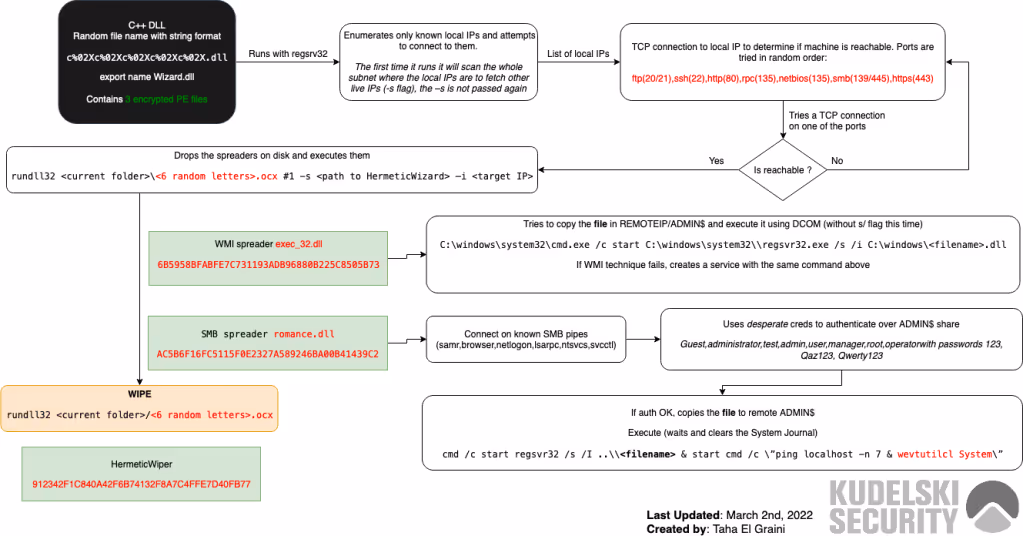 The CFC has continued to monitor information and research about the malicious software deployed against Ukraine. As part of this monitoring, the Kudelski Security Detection Engineering team analyzed the worm component named “HermeticWizzard” to ensure the CFC’s security analysis team remained informed about how destructive attacks against Ukraine were carried out. As an example of this analysis, the following diagram was created by our team describing the logic and potential indicators of compromise of this new worm component: