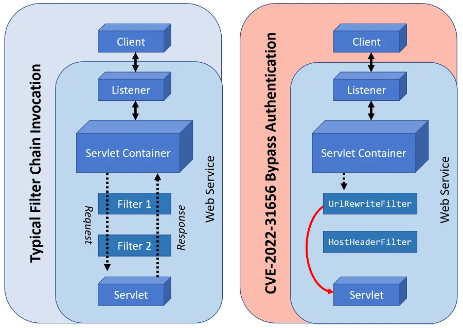 The following image illustrates how the CVE-2022-31656 Authentication Bypass exploit occurs, as compared to a typical filter chain configuration utilized in Java Web Applications.