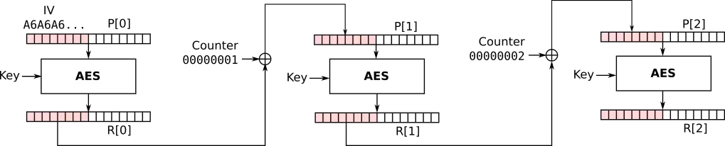 This operation is iterated 6 times, and the final R values obtained are outputted as the ciphertext. Decryption works in exactly the same way but in reverse order. The initialization vector (IV) can be any value but the RFC default value is 0xa6a6a6a6a6a6a6a6. It allows for verification of the integrity of the decrypted key after the decryption. If the last decrypted block yields a value that starts with the IV, decryption is considered correct as long as no other error is returned. GPG uses the implementation of AES key wrap provided by the Libgcrypt library. In GPG, the cached item encryption is used to prevent attackers from simply grepping for passphrases in memory as commented in gnupg/agent/cache.c (GPG version 2.3.4):