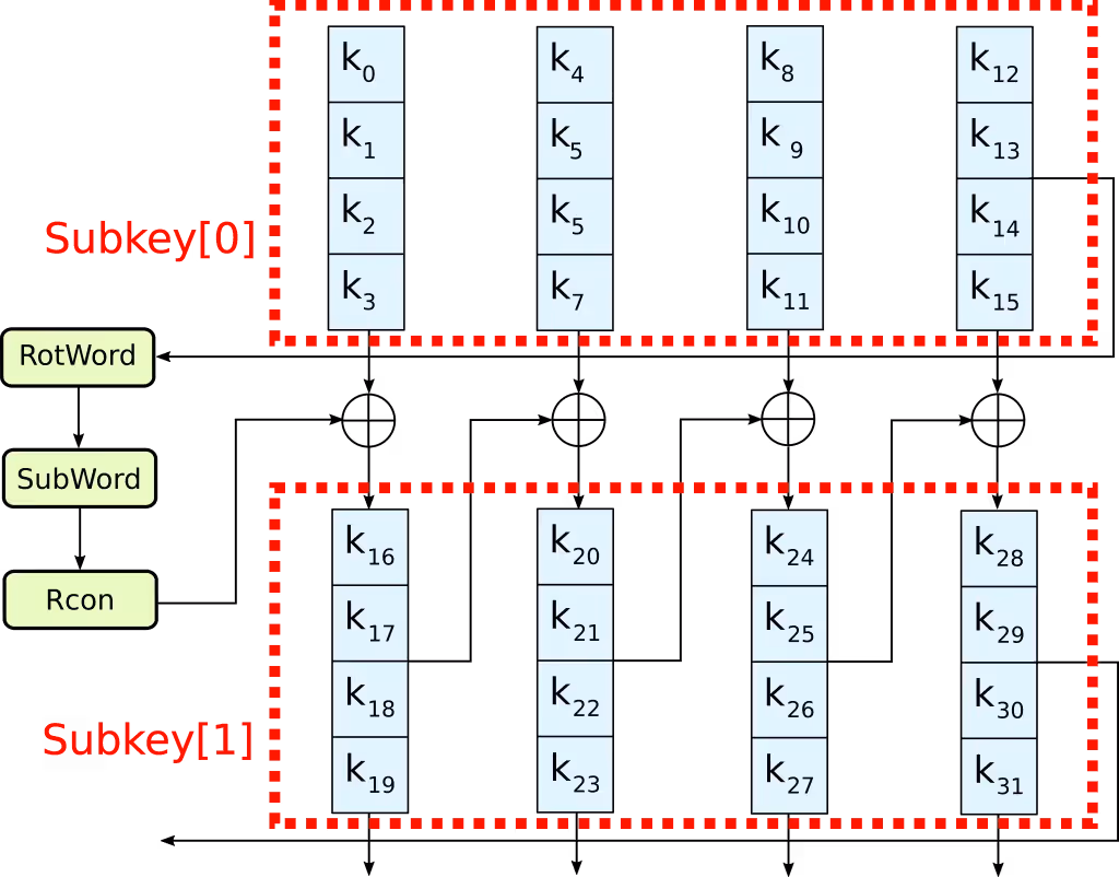 These subkeys are usually stored consecutively in RAM and there are relations between each consecutive subkeys. Thus, we scan the memory byte per byte trying to see if at this position the AES key schedule relation are verified. If it is the case for two consecutive rounds, there is a very high probability that there are subkeys stored at this location. We scan the process memory until we find a 128-bit expanded AES key. Then we use this key to decrypt the cached item. If the integrity of AES key wrap is verified we know we have properly decrypted the cached item and recovered the passphrase.