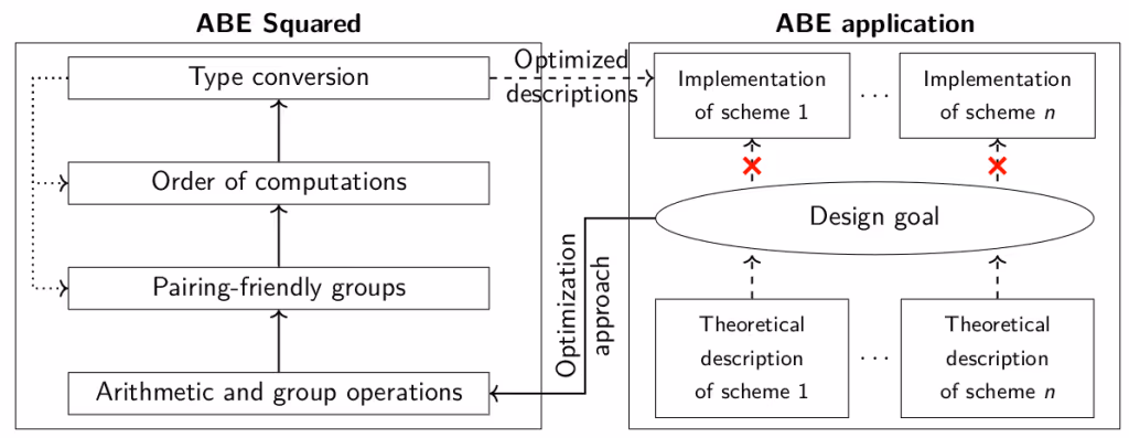 ABE Squared takes into account all the layers of optimization. As inputs, it receives the theoretical description of the scheme and produces the description of the scheme that directly yields the most efficient implementation.