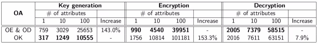 - Finally, if we compare an optimized decryption variant with an implementation optimized for key generation we see that the latter requires around 8 % more cycles. In this case, the percentage is small, because in ABE, the decryption algorithm involves mainly pairings operations and less group operations.