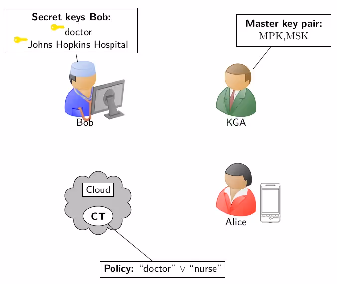 An ABE scheme generally consists of 4 algorithms: Setup, Key generation, Encryption and Decryption. In a typical ABE deployment, a party, e.g. Alice, wants to protect her sensitive data according to a particular access policy based on attributes e.g. doctor OR nurse. In order to do that, Alice will request to a Key Generation Authority (KGA) the master public key (MPK) of the system, and she will encrypt her data accordingly.