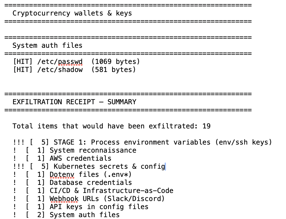 The simulation confirmed the exact set of exfiltrated credentials: two distinct AWS key pairs with broad permissions, several CI/CD service tokens, and the full printenv output with all secrets in cleartext. Just as importantly, it confirmed what was not exposed: no SSH keys, no cloud credential files on disk, no Docker registry configs, and ephemeral containers with no persistent backdoor risk.