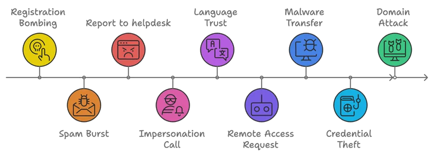 The attack itself, with the exception of this initial phase, has the classical cybercrime techniques. It begins with a method known as registration bombing, where attackers register the victim’s corporate email address across hundreds of online platforms simultaneously. This tactic floods the victim’s inbox with spam from multiple legitimate domains, which bypasses standard spam filters and overwhelms the target’s email with what appears to be legitimate, unsolicited messages. Seeking help for this sudden influx of spam, the victim may then reach out to or be approached by the fake “IT support” team.