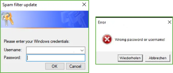 When executed, the antispam.exe binary triggered a Windows pop-up titled “spam filter update,” and asks for victim’s username and password. Once the victim enters their credentials, the username and password is validated against the domain and both the username and password entered by the user are saved in clear text to the “qwertyuio.txt” file. If invalid credentials were entered, the file would record the input along with a note indicating that the credentials were invalid, and the window pops up again asking the user to re-enter their username and password.