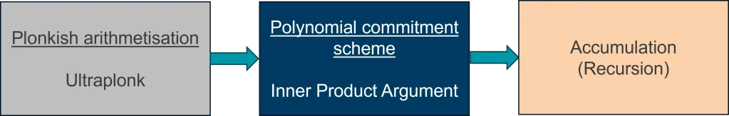 Halo2 eliminates the need for a trusted setup by employing an Inner Product Argument (IPA) based on the Pedersen commitment scheme. Although IPA typically results in larger proofs than the PLONK SNARK, Halo2 mitigates this drawback through the use of Accumulation. This mechanism allows for the aggregation of multiple proof openings via recursive composition, resulting in an effective balance between proof size and the advantages of a trustless setup. By leveraging these techniques, Halo2 achieves a scalable zero-knowledge proof system without compromising on security or efficiency.