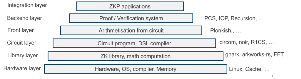 However, the ZKP stack encompasses far more than just circuit design, as illustrated below. A comprehensive ZK audit should therefore examine all aspects of the ZK stack, including the soundness of protocols, the secure implementation of cryptographic algorithms, the correct usage of parameters, and the dependencies involved.