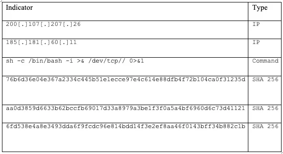 Table description: the first two IOCs are IP addresses, the third is a command, and the last three reference files associated with the Oracle exploit script, respectively named: