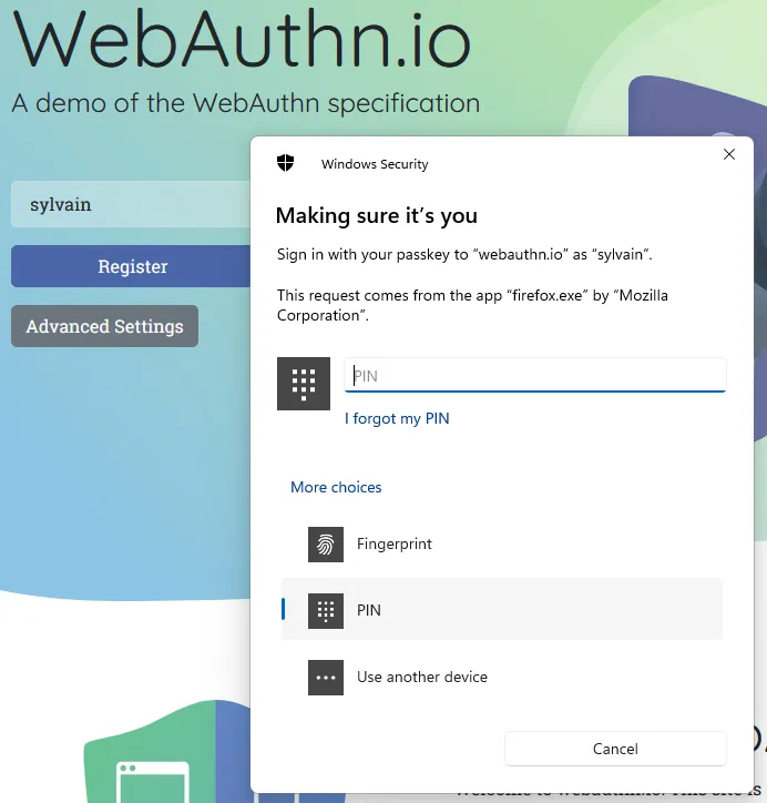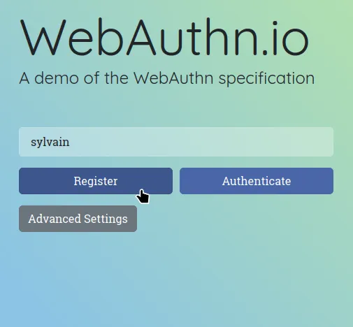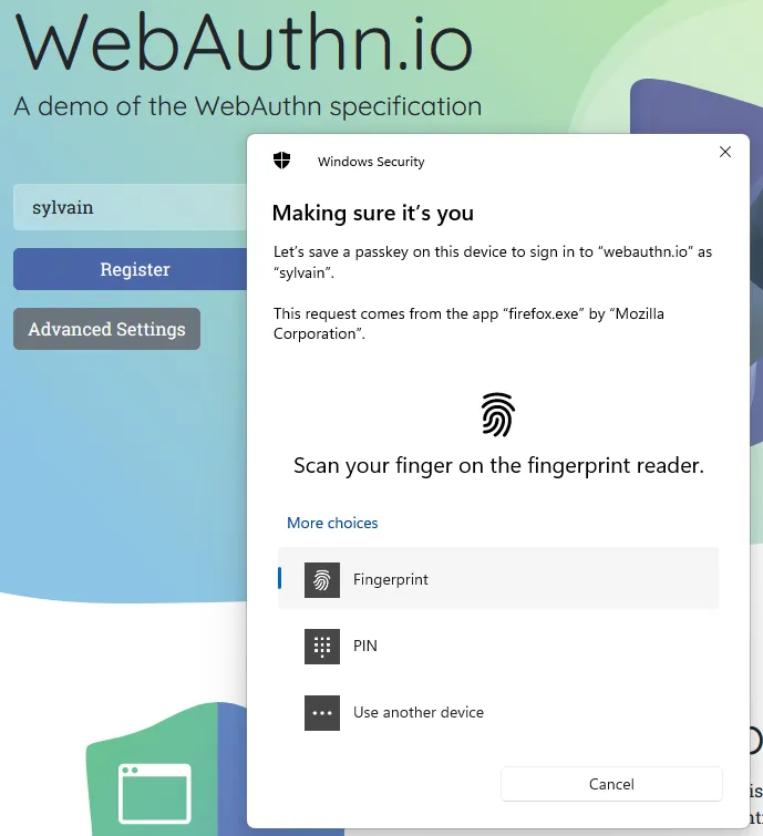 If we click on “Register” button, the browser will start the credential creation. Practically speaking, the navigator.credentials.create()