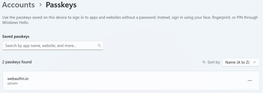 Finally in Windows, the passkeys are secured by Microsoft Hello using the system TPM (if available). We can manage the saved passkeys in the Passkey settings menu: