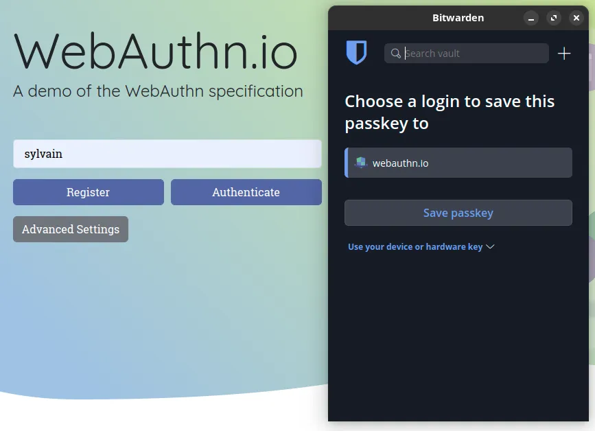 Lets see how the Bitwarden browser extension works. As soon as the extension is installed in the browser, when we browse to a service using passkeys we see the extension intercepting the Webauthn calls and displaying its own pop-up allowing to save the passkey in Bitwarden.