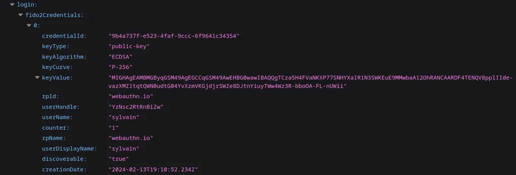 It is interesting to see how everything is generated in the case of Bitwarden compared to a hardware security key where information like the private key is never accessible. Finally, when the passkey is created, it is stored encrypted in the same way as the Bitwarden passwords. The passkeys are also synchronized to the Bitwarden server with a end-to-end encryption and may be accessible to other devices of any brand with Bitwarden installed. This slightly mitigates the problem of vendor lock-in as described previously. An additional interesting feature is that the private key can be exported from the vault in JSON format. This may allow using passkeys in another password manager: