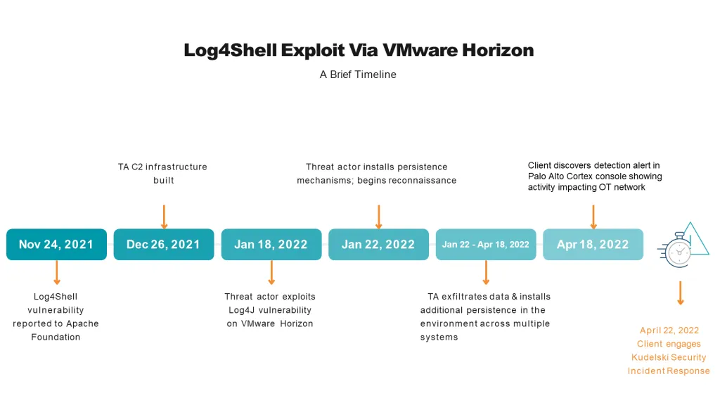 The Incident Response team correlated results from threat hunting and digital forensic artifact analysis to identify compromised machines. This led to additional IoCs and more machines to investigate. Based on IoCs from the FBI, we were able to identify initial access as a Log4Shell exploitation of the network’s VMWare Horizon environment on January 8, 2022. Additional investigation showed that the threat actor stood up their command and control (C2) infrastructure on December 26, 2021. This was only a month after the discovery of Log4Shell on November 24, 2021.