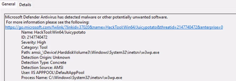 The attacker attempted to reflectively load the Juicy Potato tool, a well-known privilege escalation tool allowing local privilege escalation from a Windows Service account to “NT AUTHORITY\SYSTEM”. This attempt failed as the AMSI still detected the loading attempt and the antivirus blocked its execution.