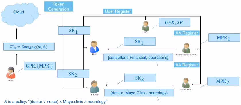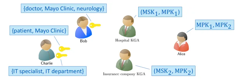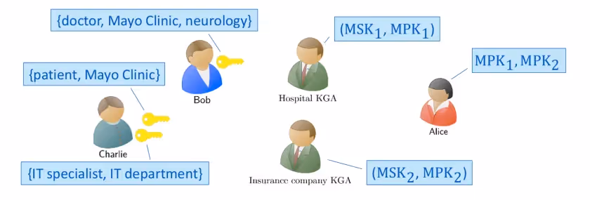 For instance, in this case both Bob and Charlie can receive attributes from two attribute authorities, the Hospital and the Insurance company authorities.