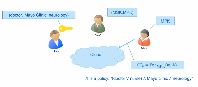 For instance, in the example below, Bob has the following attributes: “doctor”, “Mayo Clinic” and “neurology”. In this particular case, another user in the system, Alice, can encrypt a message for Bob using the following policy: “(doctor or nurse) and Mayo clinic and neurology”. Bob can then decrypt this message since using his attributes i.e. doctor, “Mayo Clinic” and “neurology”, he can satisfy the policy utilized by Alice.