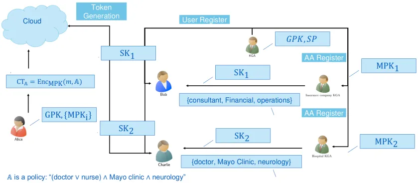 generates a symmetric encryption key that uses to encrypt a message. The message is encrypted using the following policy: ‘(doctor or nurse) and Mayo Clinic and neurology’. Using the token generation mechanism of DAC-MACs [1], Charlie can obtain the ciphertext created by Alice and obtain the content key that opens the sensitive data shares by Alice.