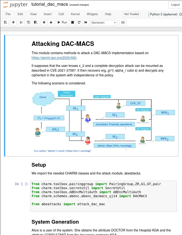 Further, we have prepared 3 Jupyter notebooks where ABE and the practical attacks against the ABE schemes are illustrated (available at https://github.com/kudelskisecurity/abeattacks/jupyter/). These notebooks can be used to learn more about the attacks in practice.