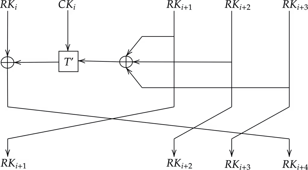 According to the draft IETF, SM4 is a block cipher taking a 128-bit key and performing 32 rounds on a 128-bit plaintext block. Like AES, it is composed of a key schedule. It generates 36 round keys of 32 bits each. The first four round keys are the secret key XORed with the constants FKs called the family keys. Then, each round key is generated according to the following diagram, where the CKs are constants defined in the standard.
