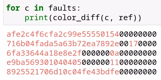 After a scan of several days we obtain some interesting faulted ciphertexts for a plaintext set to “A” sixteen times. We used our tool on them: