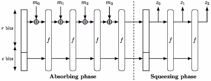 - and 4: ABSORB(n), SQUEEZE(n) are used to either add elements to the sponge or retrieve information from it.