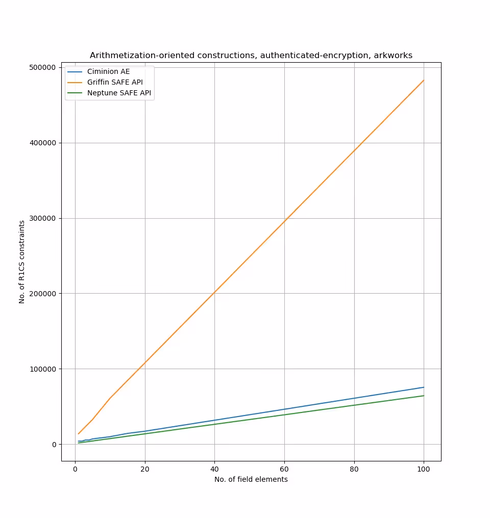 In order to obtain a fair comparison on the performance of the hashing and authenticated-encryption primitives, we have obtained the required number of R1CS constraints for every construction.