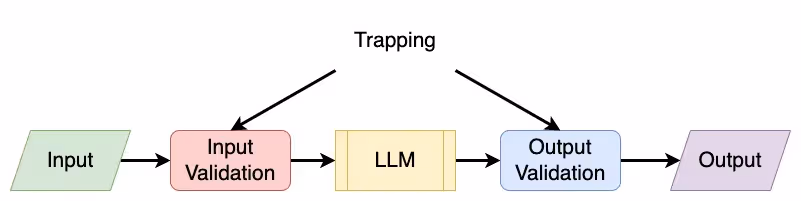 Trapping controls are the ones you put around the LLM, where you apply rules to the input to and output from the LLM prior to passing the output on to the user or another process. You can think of this as more traditional input and output validation. Trapping can be used to remove pieces of text, restrict the length of data, or apply any other rules you’d like.