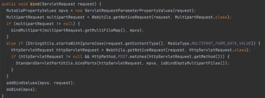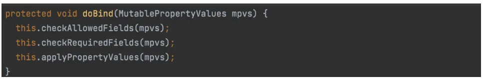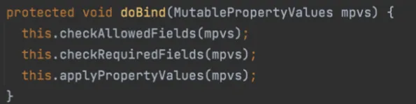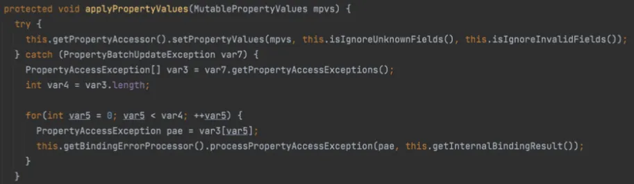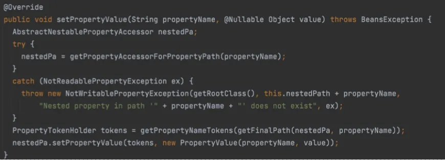 As shown above, we get a propertyAccessor (beanWrapperImpl wrapping our target object) and invoke setPropertyValues which delegates to AbstractNestablePropertyAccessor#setPropertyValue for each value.
