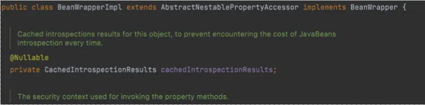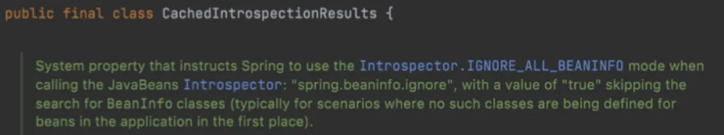 CachedIntrospectionResults is an internal class that caches JavaBeans PropertyDescriptor information for a Java class.