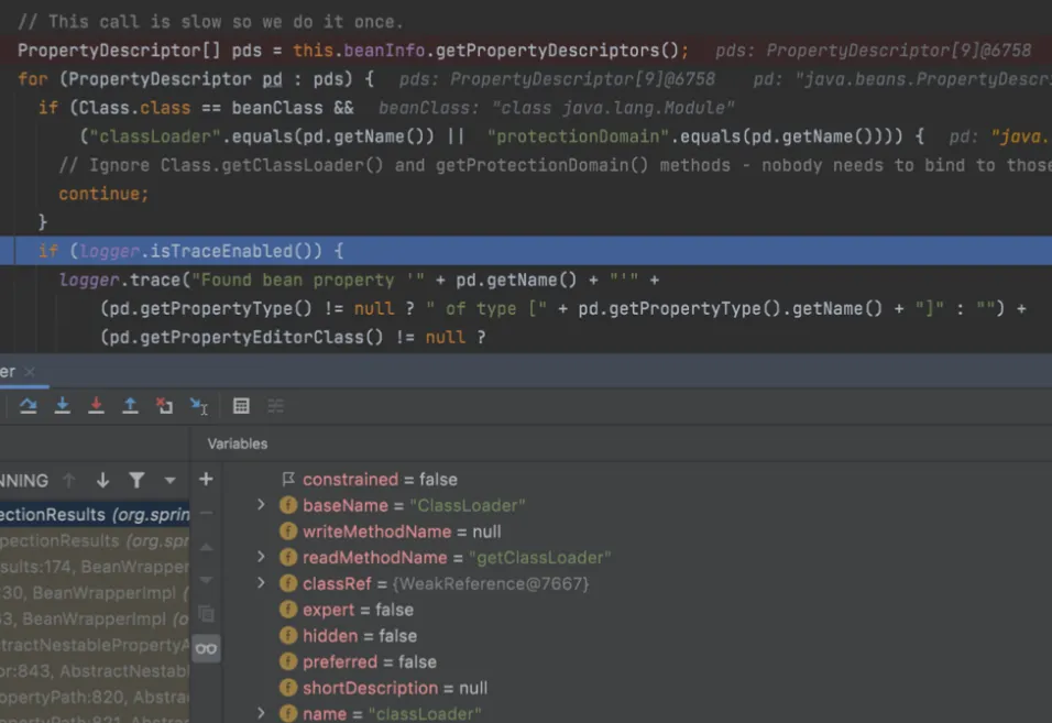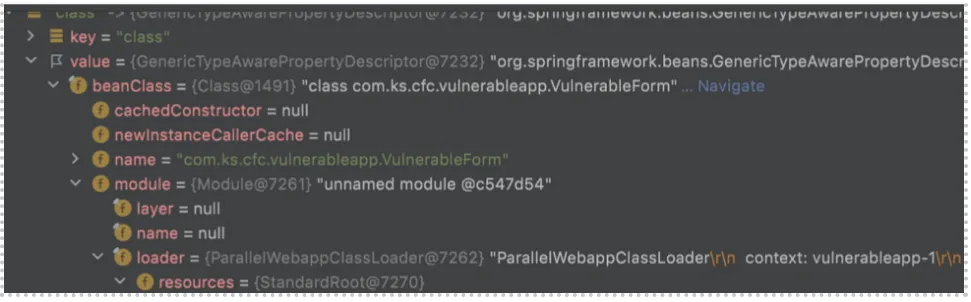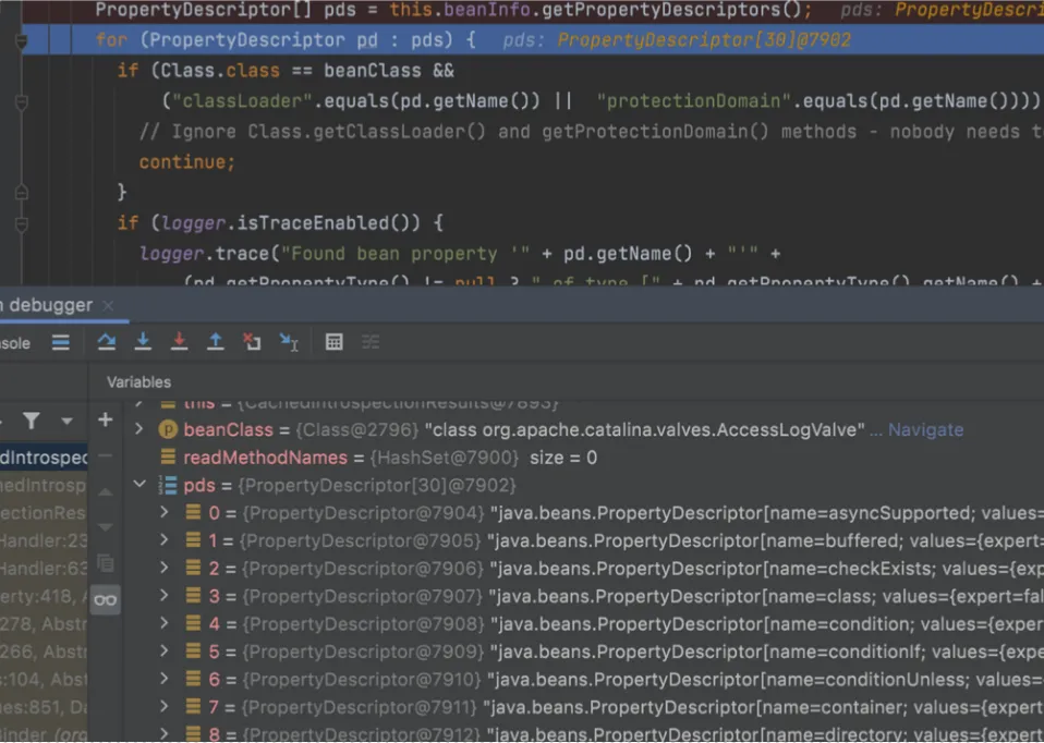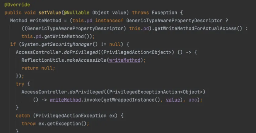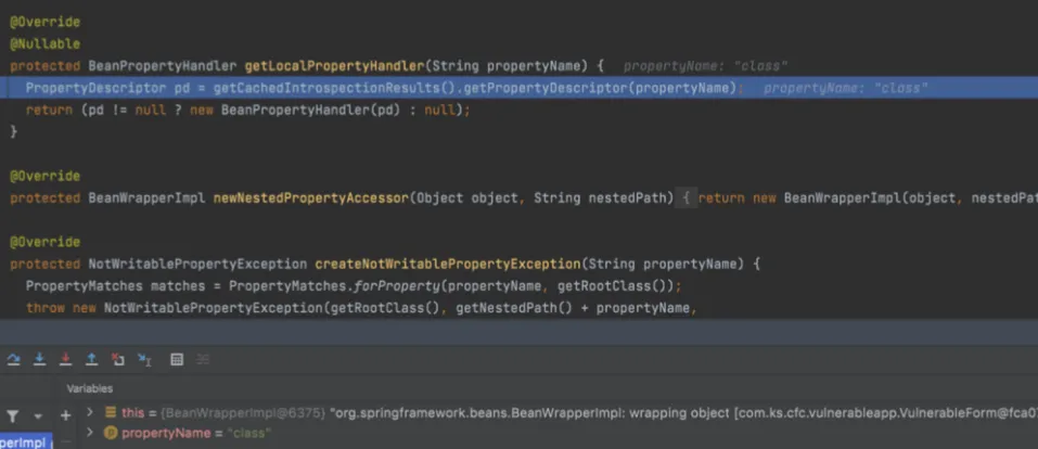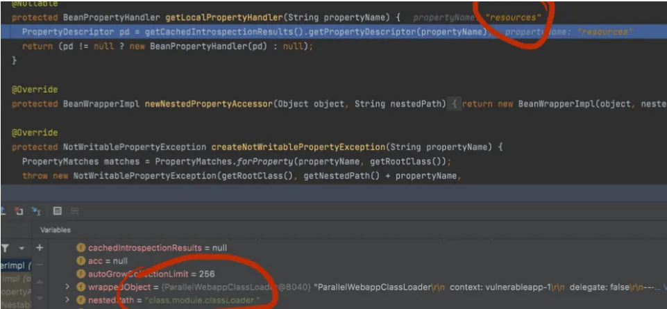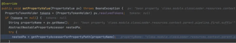 Basically, when AbstractNestablePropertyAccessor#setPropertyValue is invoked, its says like look, we have this property class.module.classLoader ….. and we want it to be set it the target instance with the surfaced value. However, as seen, properties are nested, getPropertyAccessorForPropertyPath is invoked to obtain a propertyAccessor for the target nested field. The getPropertyAccessorForPropertyPath will recursively navigate to return a property accessor for the nested property path.