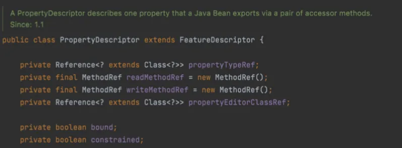 A PropertyDescriptor describes one property that a Java Bean exports via a pair of accessor methods.