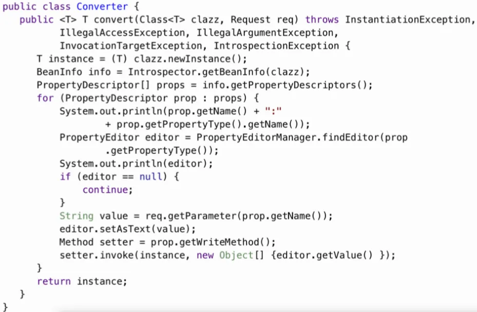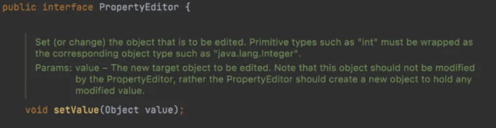 In essence, many object properties can be changed by combining PropertyDescriptors and PropertyEditors. Spring uses the java.beans.PropertyEditorManager to find the property editors needed. An example is shown below.