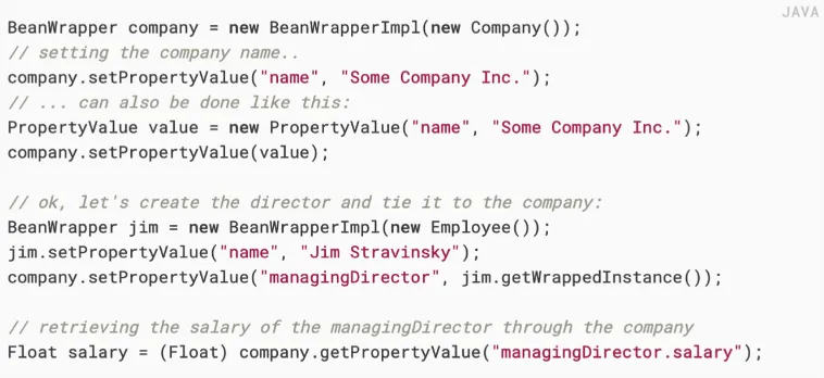 Setting and getting properties is done by using the setPropertyValue, setPropertyValues, getPropertyValue, and getPropertyValues methods which come with a couple of overloaded variants.