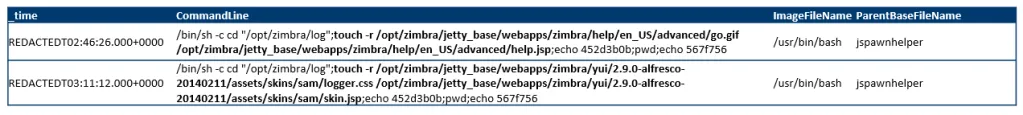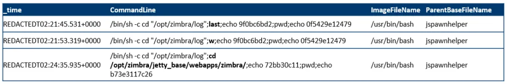 After appearing to search for webshells, the attacker received a status code “200” on one of the deployed Java pages /opt/zimbra/jetty_base/webapps/zimbra/public/jsp/Startup3.jsp (see figure 1) and started interacting with it by executing some enumeration commands (see figure 2 – for who is logged on and what they are doing)