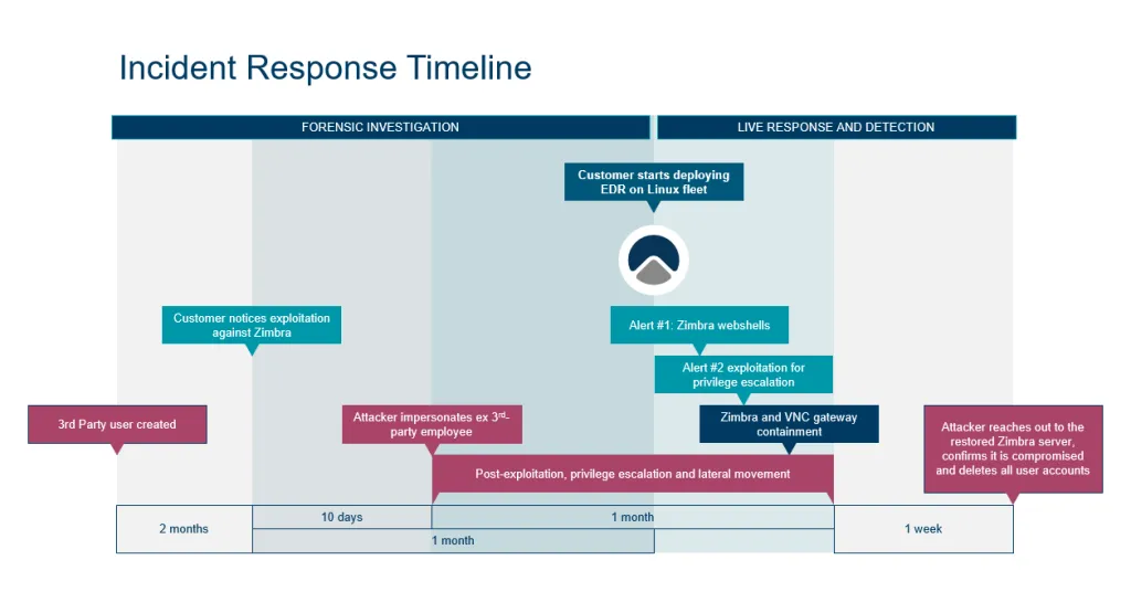 Their account’s most recent activity occurred during the incident’s timeline. This allowed us to confidently establish the link between Zimbra as patient-0 and the contractor’s VNC gateway as the first host in the lateral movement kill chain.