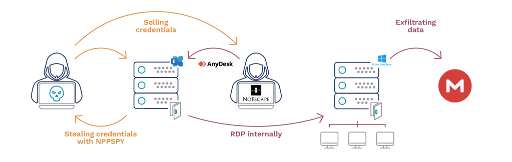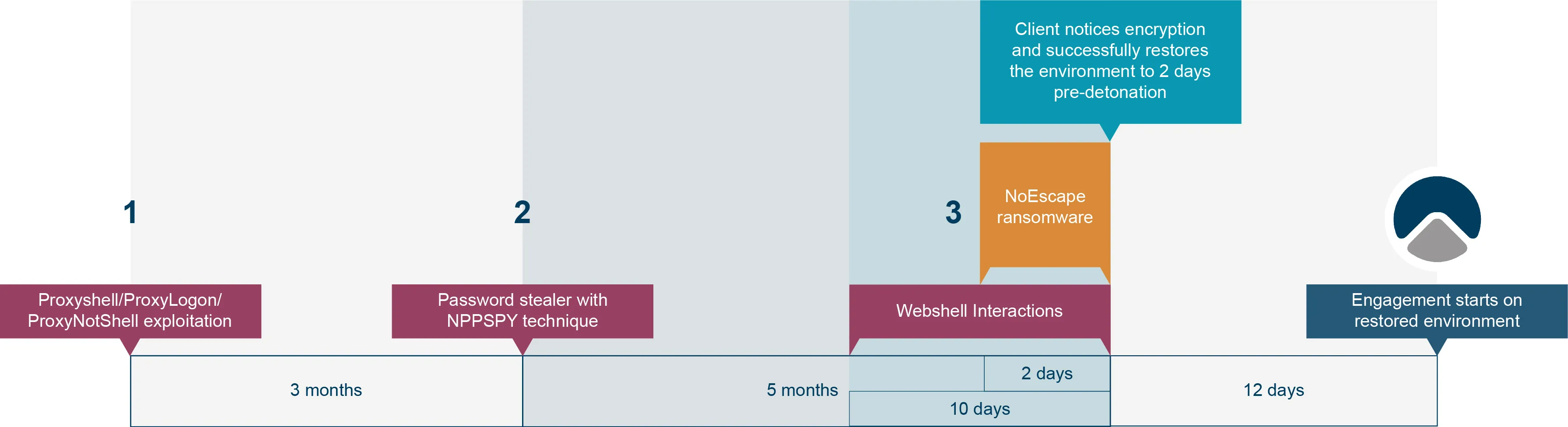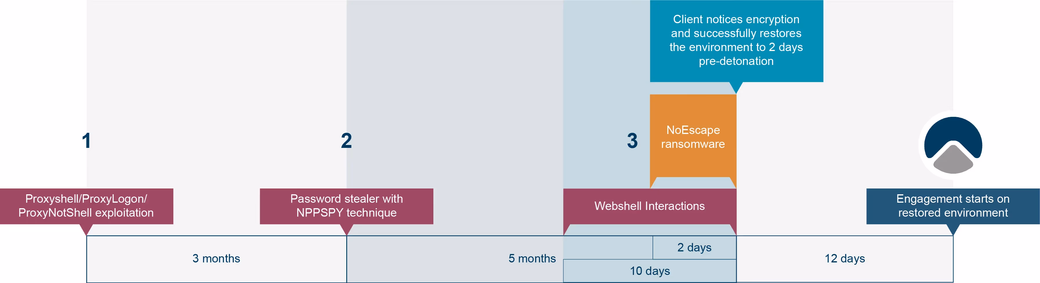 Given the large delay (8 months) between the first evidence of NPPSPY usage and NoEscape active engagement with the target, it is unlikely that the ransomware actors are behind the exploitation attempts cited so far. We believe NoEscape bought access in the form of cleartext passwords and webshell locations from Initial Access Brokers.