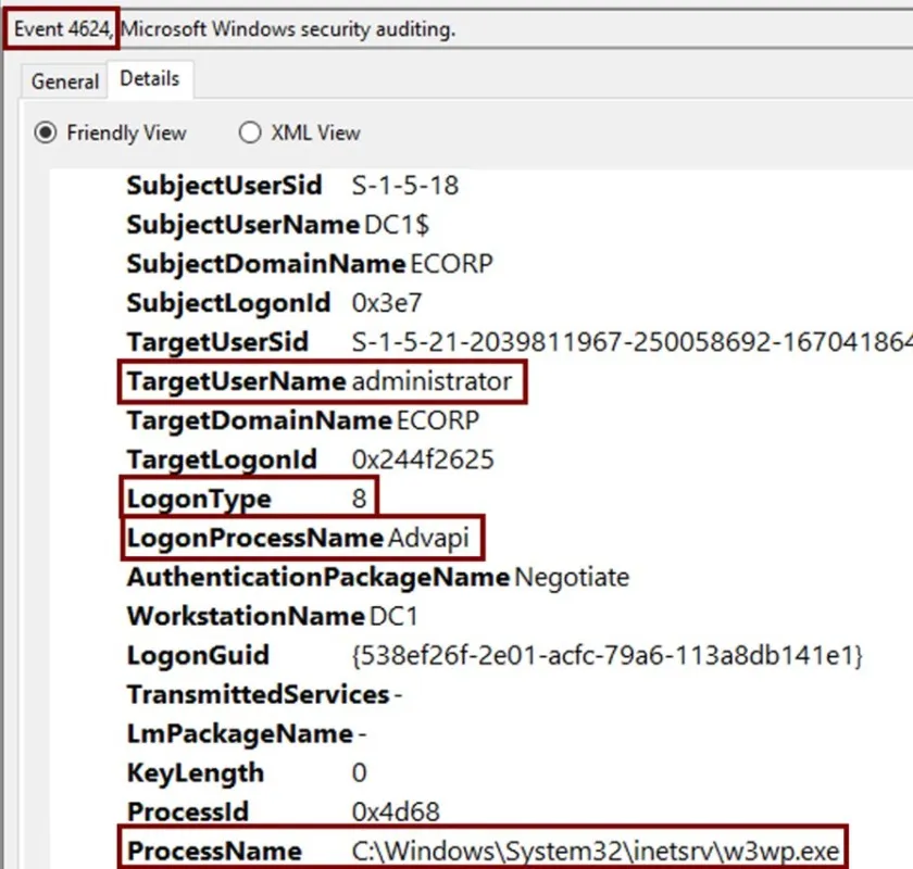The corresponding event log for this Exchange Web Authentication corroborates our observations about IIS Basic Authentication as the logon attempt is Type 8: network clear text (Figure 15).