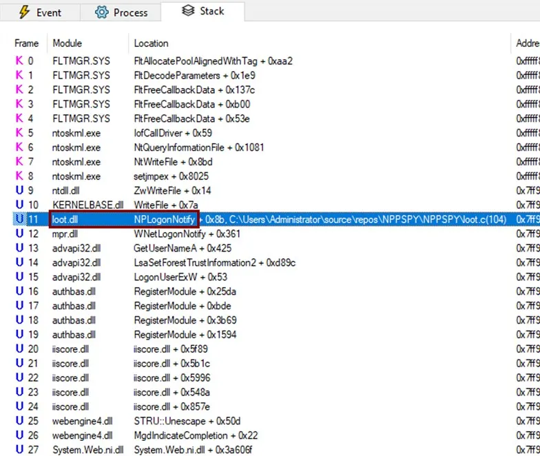 The stack trace confirmed that OWA authentication went through the Malicious Network Provider and called the NPLogonNotify API for loot.dll.