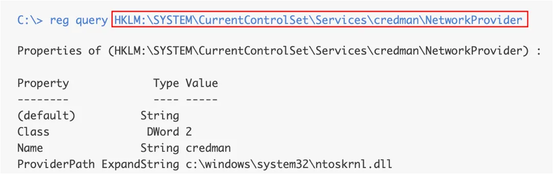 The documented steps of the technique would mean that the attacker would have had to make some changes in the registry, so this gave us a lead to test the NPPSPY hypothesis. When we queried the registry for traces of the exploit, we found a new network provider had been introduced (see Figure 7).