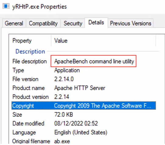 This file masked as the ApacheBench command line utility but proved quickly to be a Meterpreter stager. The Meterpreter stager is built on a template executable, which allows the malicious shellcode to be injected into the .text section.