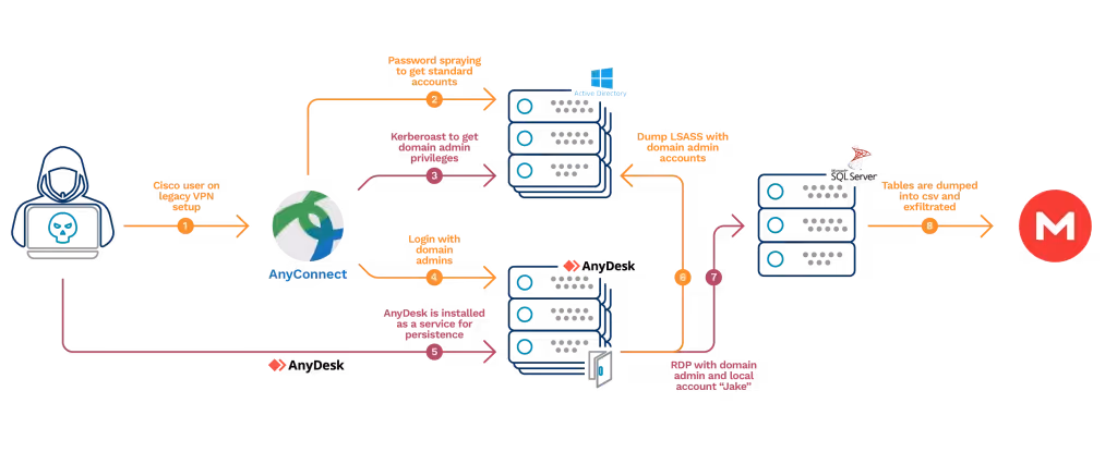 It is worth mentioning that the attackers moved from nobodies to domain admins in exactly three passwords. They guessed the VPN user, then the domain user finaly that of the domain admin via kerberoast without using any malware in the environment; the attackers performed all these actions from the comfort of their own machines. The fact that they used unmanaged assets to do this is a reminder that security tooling investments must be complemented with proper hygiene around securing accounts, particularly the privileged ones.